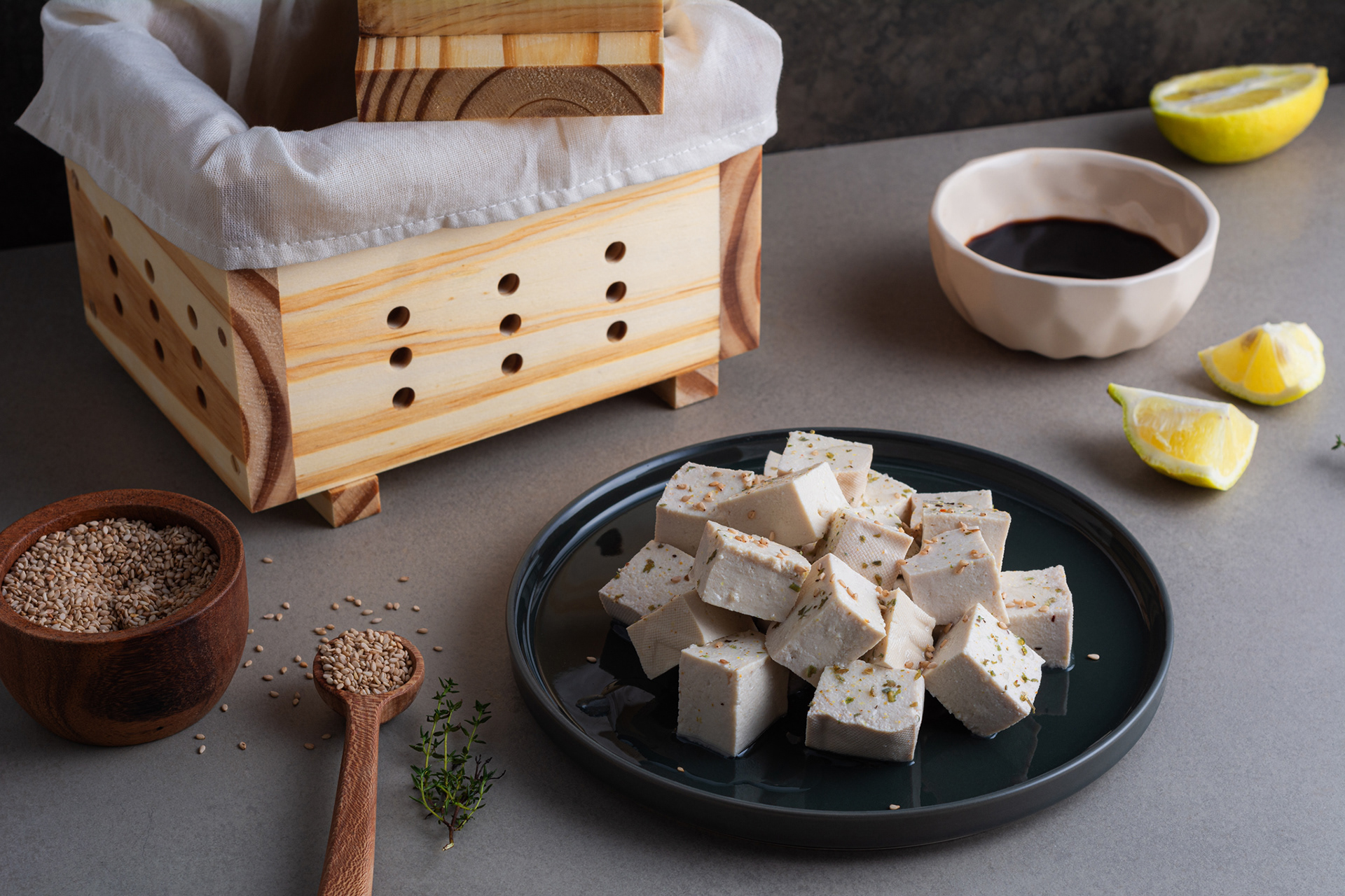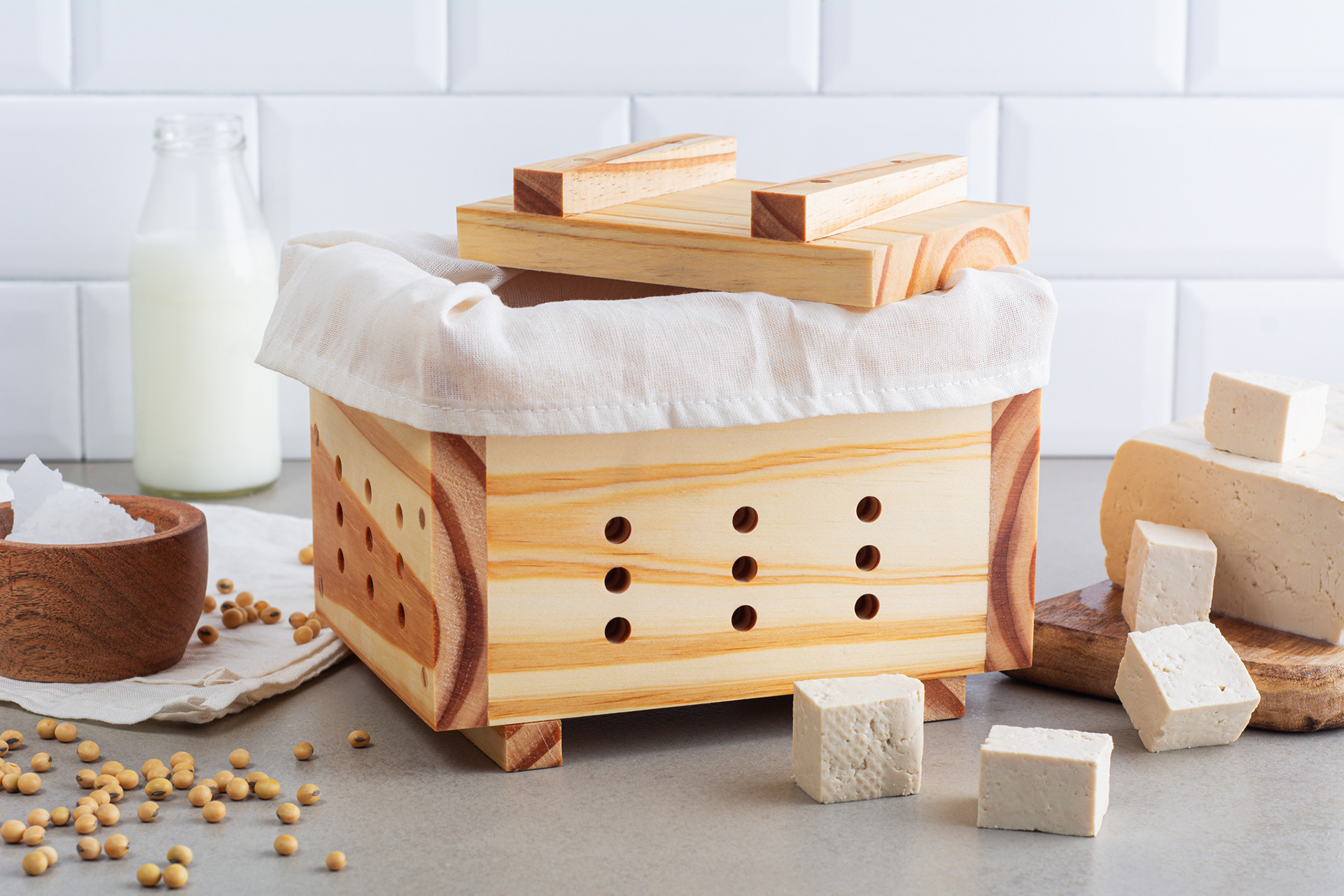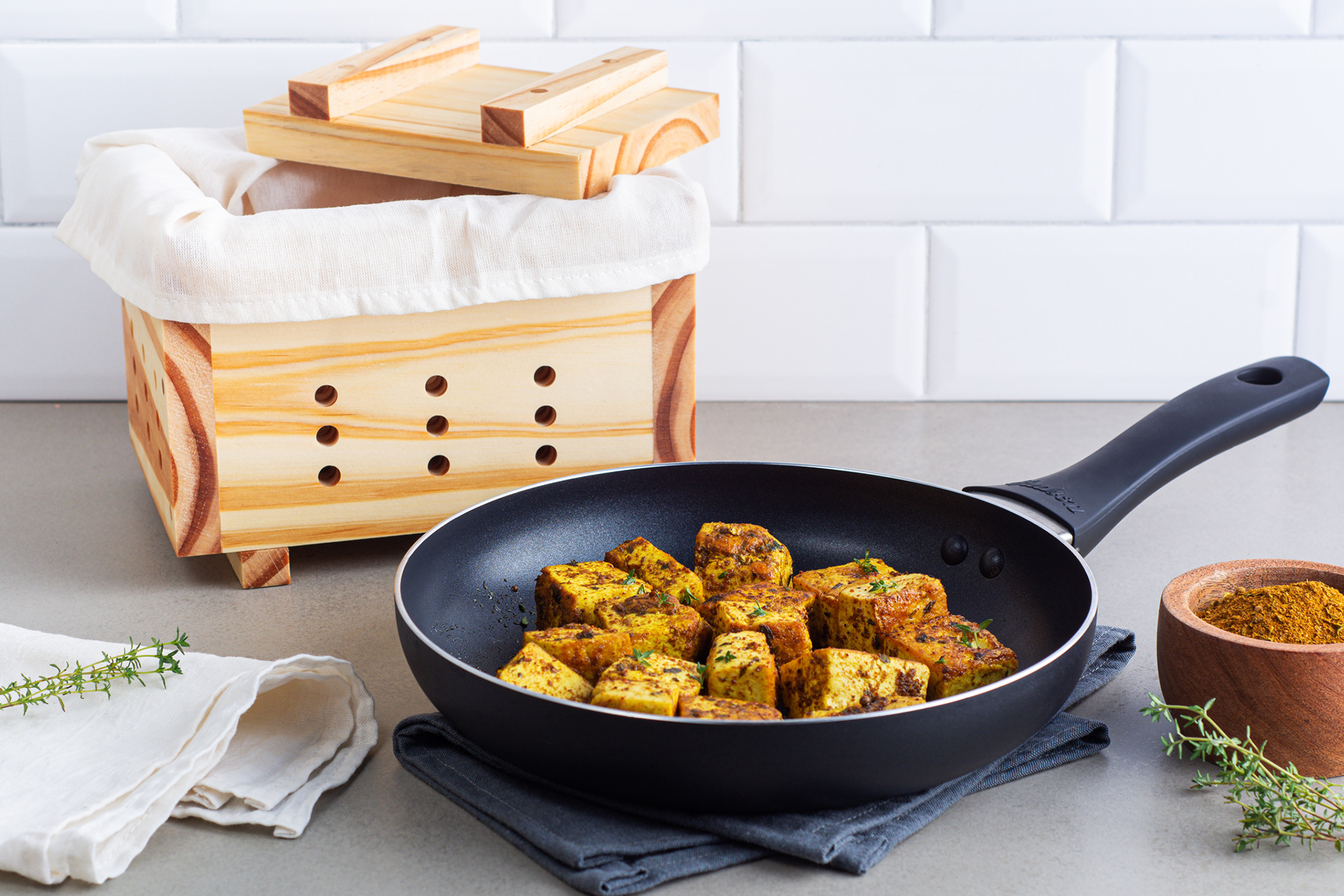 Trabajo para cliente fabricante de prensas de tofu, Tofunny, de foto producto con ambientación para sitio web y con fondo blanco para ecommerce.
